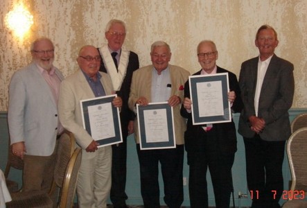 In July, four Harrogate Brothers celebrated their 40 year anniversaries and Province 3 Director and Harrogate Brother, John Tweddle, was on hand to present three of the Brothers with their anniversary scrolls, with a personal presentation to be made to Brother Barry Austin, who couldn’t attend on the evening. Brother President, Chris Bohills also presented a second Presidential bar to Brother Simon Gilbert following his third term as Harrogate President in 2020/22. In addition, John Tolan, John Tevlin and Simon Gilbert were presented with their 40-year miniatures.